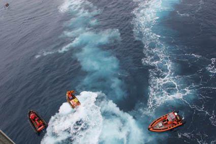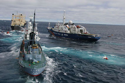 Greenpeace ship MY Esperanza and her inflatables , and inflatables from the Greenpeace ship MY Arctic Sunrise try to hinder the transfer of a dead minke whale from theJapanese whaling fleet catcher ship Kyo Maru No.1 to the Nisshin Maru factory ship. Southern Ocean. 21.12.2005