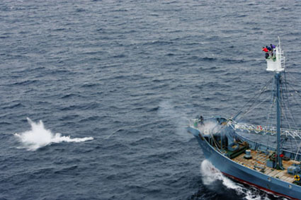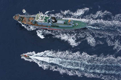 Inflatables from the Greenpeace ship MY Esperanza hinder the hunting, of minke whales by the Kyo Maru No. 1