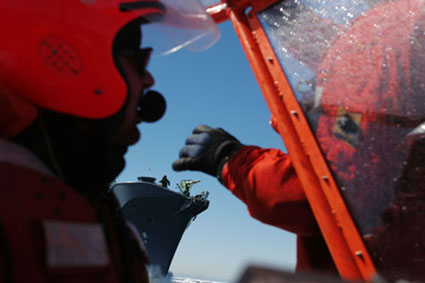 We reached the scene quickly, and immediately were in the midst of it all.. Alain, in the ‘Billy G’, tells us the harpoonist had been deliberately aiming the harpoon at their boat. Minutes later as we round the front of the catcher the harpoonist does indeed swivel on his green deck, pointing the ominous yellow harpoon with it’s black explosive tip in our direction. It is frightening. It is plain intimidation, but it works. I want to react, but don’t want to provoke the guy. I try to turn away, to look elsewhere, but it’s scary to not know what is happening behind you. Where to look, what to do? We radio the Esperanza, our ship, to tell them, perhaps subconsciously hoping that somehow this will be a guarantee of safety.
