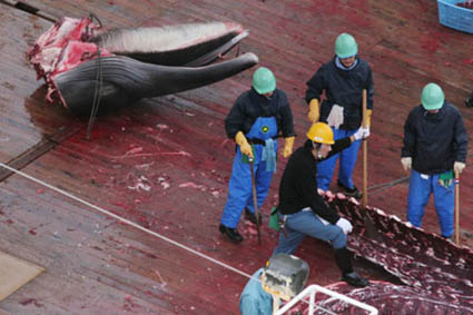 Flensing a minke whale on the blood stained deck of the Nisshin Maru whaling factory ship. Southern Ocean,
