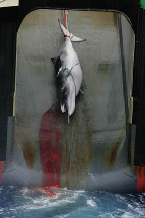 The Yushin Maru catcher ship of the Japanese whaling fleet injures a whale with its first harpoon attempt, and takes a further three harpoon shots before finally killing the badly injured fleeing whale. Finally they drowned the mammal beneath the harpooon deck of the ship to kill it.