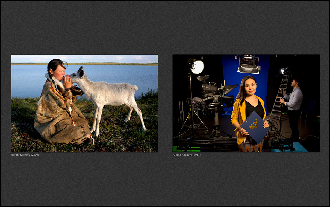 These two photographs are of Albina Rocheva, a young native Nenets woman from a Siberian reindeer herding family. The photo of her aged 13 (left), with her pet reindeer calf, I took in 2000 when I stayed with her family at their remote camp on the tundra in the northwest of the Siberian Arctic. The second photo (right), I took in 2017, of her aged 30, in the TV studio where she now works.