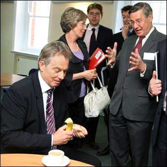 Afterwards I was asked to go to the green room and photograph a smaller meeting. Blair was clearly a little peckish so everyone stood around while he ate a banana. It was one of those precious unscripted moments and I got a few frames before I was stopped. The man on the right of the picture was actually talking to Patricia Hewitt.